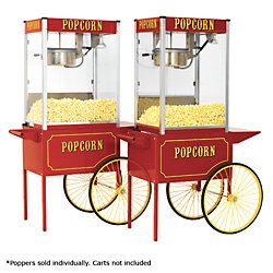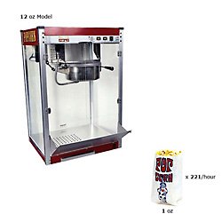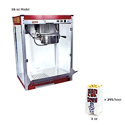 Pop like the pros! These commercial popcorn makers to suit your high volume popping needs. These Paragon theater popcorn machines are the highest commercial quality. The anodized aluminum kettle has the highest possible heat transfer to pop kernels quickly with very few un-popped. Takes only three to five minutes to make popcorn. The warming deck keeps the popcorn the ideal temperature and ready to serve. Easily clean the stainless steel interior and empty the handy kernel drawer. These durable, old-fashioned poppers are the best popcorn makers available and are designed for everyday commercial use. Perfect for high volume establishments like movie theaters, stadiums, arenas, amusement parks and convention centers. Get a matching cart to easily move the machine to highest volume locations. Cart sold separately. Please note the 16-ounce model requires a NEMA 5-30 receptacle to plug it in. Features: Makes popcorn in 3 to 5 minutes. Anodized aluminum kettle. Sanitary stainless steel interior. Tempered glass panels. Warming deck keeps popcorn ideal temperature. Kernel drawer for easier cleaning. Internal presentation light. Perfect for high volume establishments like movie theaters, schools, stadiums, arenas, amusement parks and convention centers. Specs: 12 oz Dimensions: 24"W x 36"H x 20"D. 12 oz model pops 221 oz per hour. 12 oz model has standard 3-prong plug. . 16 oz Dimensions: 28"W x 36"H x 20"D. 16 oz model pops 295 oz per hour. 16 oz model requires NEMA 5-30 plug receptacle. . 120 Volt. NSF approved, CE listed. Made in the USA. Three year warranty on parts and labor.