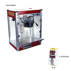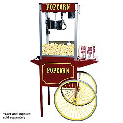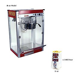 Styled like classic movie theater popcorn machines. These commercial quality popcorn poppers are easy to use and even easier to clean. The anodized aluminum kettle has the highest possible heat transfer to pop quickly and leave very few un-popped kernels. Takes only three to five minutes to make popcorn. The stainless steel interior and kernel drawer make clean up a breeze. These durable machines are some of the best popcorn makers available and will easily stand up to everyday use. Suitable for small concession stands and snack shops, bars and restaurants. Get a matching cart to move the popper to your high volume areas. Popcorn cart sold separately. Also, good for home use. Be the envy of your friends with your own home bar or home theater popcorn popper! Features: Makes popcorn in 3 to 5 minutes. Anodized aluminum kettle. Sanitary stainless steel interior with light. Tempered glass panels. Warming deck keeps popcorn ideal temperature. Kernel drawer for easy clean up. Perfect for small concession stands, snacks shops and home use. Specs: 6 oz dimensions: 20"W x 26"H x 14"D. 6 oz model pops 113 oz per hour. 6 oz electrical: 120 Volts, 1200 Watts, 10 Amps. . 8 oz dimensions: 20"W x 29"H x 14"D. 8 oz model pops 147 oz per hour. 8 oz electrical: 120 Volts, 1420 Watts, 12 Amps. . NSF approved, CE listed. Made in the USA.